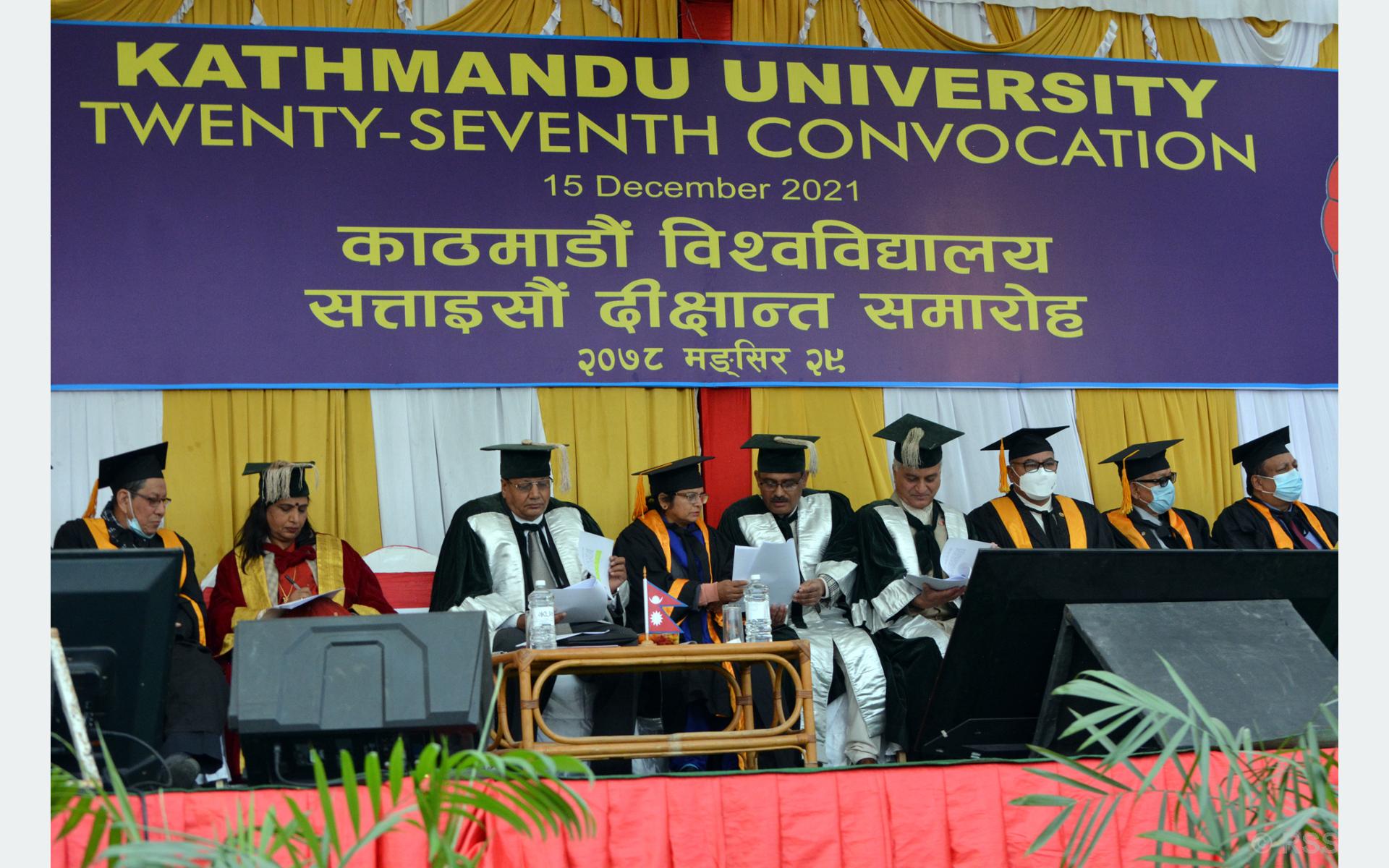 काभ्रेपलाञ्चोक, २९ कात्तिक : काभ्रेपलाञ्चोकको धुलिखेलस्थित काठमाडौँ विश्वविद्यालयको २७औँ दीक्षन्त समारोह आज सम्पन्न भएको छ । पहिलो चरणको उक्त समारोहमा प्रधानमन्त्री एवं विश्वविद्यालयका कुलपति शेरबहादुर देउवाले विश्वविद्यालय तथा स्नातक विद्यार्थीलाई शुभकामना सन्देश पठाउनुभएको थियो । कार्यक्रममा भारतीय विश्वविद्यालय सङ्घका महासचिव डा (श्रीमती) पङ्कज मित्तलले नेपाल र भारतबीच निकटको सम्बन्ध रहेको उल्लेख गर्दै संस्कार, संस्कृति र सभ्यताले छिमेकीमा प्रगाढता कायम रहिरहेको बताउनुभयो । सुन्दर मुलुक नेपाल र भारतबीचको मैत्रीपूर्ण सम्बन्ध रहिआएको चर्चा गर्दै दीक्षित स्नातक विद्यार्थी नै भविष्यको निर्माता हो भन्नुभयो ।